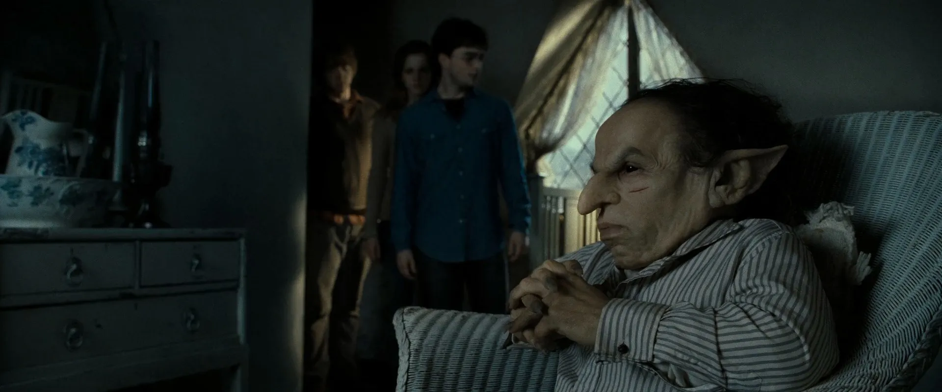 Daniel Radcliffe as Harry Potter, Rupert Grint as Ron Weasley, Emma Watson as Hermione Granger, Ralph Fiennes as Lord Voldemort, Alan Rickman as Severus Snape, Helena Bonham Carter as Bellatrix Lestrange, Maggie Smith as Minerva McGonagall, Michael Gambon as Albus Dumbledore, John Hurt as Ollivander, Tom Felton as Draco Malfoy, Warwick Davis as Griphook / Filius Flitwick, Robbie Coltrane as Rubeus Hagrid, Jason Isaacs as Lucius Malfoy, Kelly Macdonald as Helena Ravenclaw, Gary Oldman as Sirius Black, David Thewlis as Remus Lupin, David Bradley as Argus Filch, Ciarán Hinds as Aberforth Dumbledore, Gemma Jones as Poppy Pomfrey, Dave Legeno as Fenrir Greyback, Miriam Margolyes as Pomona Sprout, Helen McCrory as Narcissa Malfoy, Nick Moran as Scabior, James Phelps as Fred Weasley, Oliver Phelps as George Weasley, Clémence Poésy as Fleur Delacour, Natalia Tena as Nymphadora Tonks, Julie Walters as Molly Weasley, Mark Williams as Arthur Weasley, Bonnie Wright as Ginny Weasley, Evanna Lynch as Luna Lovegood, Domhnall Gleeson as Bill Weasley, Graham Duff as Death Eater, Anthony Allgood as Gringotts Guard, Rusty Goffe as Aged Gringotts Goblin, Jon Key as Bogrod, Ian Peck as Hogsmeade Death Eater, Benn Northover as Hogsmeade Death Eater, Hebe Beardsall as Ariana Dumbledore, Matthew Lewis as Neville Longbottom, Devon Murray as Seamus Finnigan, Jessie Cave as Lavender Brown, Afshan Azad as Padma Patil, Isabella Laughland as Leanne, Anna Shaffer as Romilda Vane, Georgina Leonidas as Katie Bell, Freddie Stroma as Cormac McLaggen, Alfred Enoch as Dean Thomas, Katie Leung as Cho Chang, William Melling as Nigel Wolpert, Sian Grace Phillips as Screaming Girl, Ralph Ineson as Amycus Carrow, Suzie Toase as Alecto Carrow, Jim Broadbent as Horace Slughorn, Scarlett Hefner as Pansy Parkinson, Josh Herdman as Gregory Goyle, Louis Cordice as Blaise Zabini, Amber Evans as Twin Girl 1, Ruby Evans as Twin Girl 2, George Harris as Kingsley Shacklebolt, Chris Rankin as Percy Weasley, Guy Henry as Pius Thicknesse, Phil Wright as Giant, Gary Sayer as Giant, Tony Adkins as Giant, Penelope McGhie as Death Eater, Emma Thompson as Sybill Trelawney, Ellie Darcey-Alden as Young Lily Potter, Ariella Paradise as Young Petunia Dursley, Benedict Clarke as Young Severus Snape, Leslie Phillips as The Sorting Hat (voice), Alfie McIlwain as Young James Potter, Rohan Gotobed as Young Sirius Black, Geraldine Somerville as Lily Potter, Adrian Rawlins as James Potter, Toby Papworth as Baby Harry Potter, Timothy Spall as Peter Pettigrew, Peter G. Reed as Death Eater, Judith Sharp as Death Eater, Emil Hostina as Death Eater, Bob Yves Van Hellenberg Hubar as Death Eater, Granville Saxton as Death Eater, Tony Kirwood as Death Eater, Ashley McGuire as Death Eater, Arthur Bowen as Albus Severus Potter (19 Years Later), Daphne de Beistegui as Lily Luna Potter (19 Years Later), Will Dunn as James Sirius Potter (19 Years Later), Jade Gordon as Astoria Malfoy (19 Years Later), Bertie Gilbert as Scorpius Malfoy (19 Years Later), Helena Barlow as Rose Weasley (19 Years Later), Ryan Turner as Hugo Weasley (19 Years Later), Paul Bailey as Gryffindor Student (uncredited), Sean Biggerstaff as Oliver Wood (uncredited), Vinnie Clarke as Gryffindor Student (uncredited), David Heyman as Dining Wizard in Painting (uncredited), Charlie Hobbs as Student (uncredited), Luke Newberry as Teddy Lupin (uncredited), Keijo J. Salmela as Gringotts Goblin (uncredited), Pauline Stone as Nurse Wainscott (uncredited), Spencer Wilding as Knight of Hogwarts (uncredited), Harrison Davis as Gringotts Goblin (uncredited), Annabelle Davis as Gringotts Goblin (uncredited)